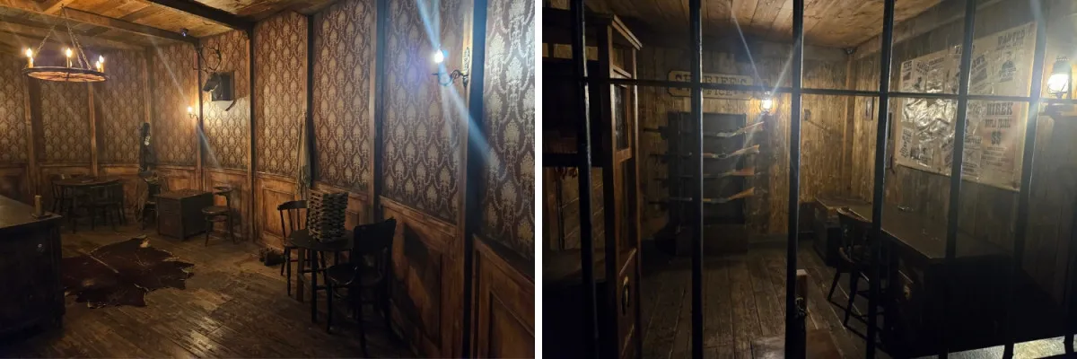 A félhomályba borult szoba minden zugát egy pislákoló lámpás kíséretében kutattuk át. A faborítású helyiségek, a lengőajtón való átkelés, a western bár hangulata olyan utánozhatatlan elemek voltak, amiktől könnyű volt belehelyezkedni a cowboy életérzésbe. Persze, ebben segített a zenei aláfestés is, és az a rengeteg korhű berendezési tárgy, amelyek Amerika hajdani, legendás határvidékének részét képezték.