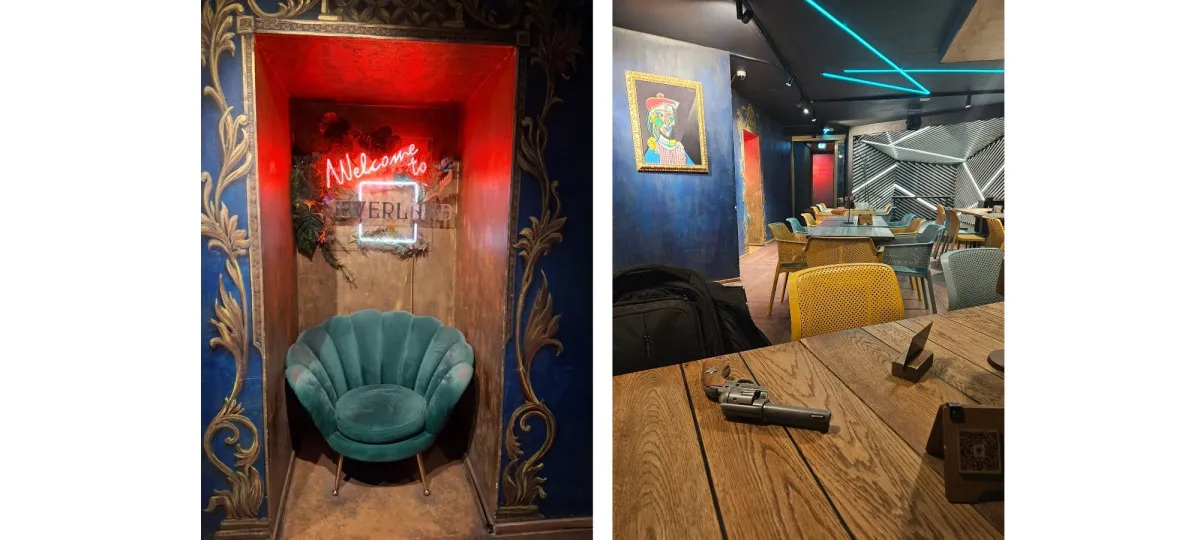 Nos, a lépcső aljára érve kiderült, hogy egy igazi fantáziaszigetre kerültünk. Sejtelmes hangulat, színes drapériák, kreatív képkeretek és táncoló neonfények fogadtak minket a bárban. Az ízléses berendezés egyből elnyerte a tetszésünket, és mivel – a kérés szerint – 15 perccel kezdés előtt érkeztünk, még belefért egy finom kávé is. Közben a játékmester elhelyezett az asztalunkon egy súlyos coltot, amiből nem nehéz kitalálni, hogy a Vadnyugati Rablást, vagyis az egyik legnehezebb szobát választottuk. Volt is bennünk némi félsz, hogy két fővel ez talán megugorhatatlan kihívás lesz.