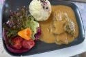 Egyikünk vadast rendelt burgonya gombóccal, másikunk ponty szeletet rántva, hasábburgonyával. Kiszolgálás udvarias, gyors. Az étel viszont továbbra is átlagos. A vadas mártás íze minden volt, csak nem vadas. A rántott halhoz mirelit hasábburgonya jár. A tálalás üzemi, semmi dekorációt, még egy pici zöldség sincs a tányéron. Fura ez manapság. Már csak azért is mert az árak a többi hasonló forgalmas vendéglátó helyhez igazodnak.