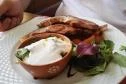 Férjem hagymalevest kért cipóban, de mikor tányérban hozták ki, megkérdeztük miért nem cipóban sikerült, azt a választ kaptuk hogy a cipó elfogyott (nyitás után fél órával, ráadásul a pincérnő rákérdezett hogy cipóban kérjük-e). A legényfogó leves jó volt és még a limonádé, ami az étlapon nem szerepelt, így árát sem tudtuk. . De ez lett volna a legkevesebb. Joghurtban és mustárban pácolt csirkecomb filét kértem, négysajtmártással és vegyes idénysalátával. Kaptam egy íztelen, rosszul filézett, néhol nyers húst kaptam, egy szimpla besamel mártással és a vegyes idénysaláta savanyúságot takart tejföllel leöntve. Mindent összevetve, a szakács és a vezetőség nem állt a helyzet magaslatán, szinte menekültünk onnan. Hosszú évek óta az első balszerencsés ebédünk volt ez.