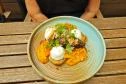 A bejáratnál egy fiatalember fogadott bennünket és rendkívül udvarias módon bevezetett, bemutatva az elfoglalható asztalokat. A teraszt választottuk. Aztán pillanatokon belül megjelent a szintén nagyon fiatal és udvarias személyzet lezseren öltözött, de ápolt külsejű több tagja, tájékoztatást adva napi különleges étel ajánlatukról, tudakolva kívánságainkat. Végül az étlapról választottunk. Az étlapi választék ugyan nem volt túlzottan bőséges, de számunkra már jelezte, hogy a kevesebb fogás biztosan jobb minőséget jelent. Már az ételek elnevezéséből is feltűnt, hogy a hagyományos magyaros ételeket újszerű módon színesítik. Marhapofát vadas krémmel, bécsi szeletet majonézes krumplisalátával választottunk. Hamar megkaptuk a frissen elkészített fogásokat. A tálalás elegáns, ízléses, az adag pedig pont megfelelő volt. Mindkét fogás húsai puhára, omlósra voltak elkészítve. Az ízvilág harmonikus, jól megkomponált. Egy szóval: tökéletes! Mindössze annyi észrevételem lenne, hogy a majonézes krumplisaláta burgonya darabjait talán szelhették volna apróbbra is, de ez csak egy szubjektív vélemény. Az ár/érték arány megfelelő. A hely nem igazán olcsó, de megéri! Jó szívvel ajánlom!