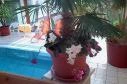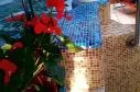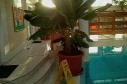 Egyébként rend, tisztaság, az egész épületben. A laptopot a kisasztalra téve, a tápkábelt a közlekedési útvonalon keresztül vezetve lehetett csatlakoztatni a 220 V-ba. A medencék. Mivel az épületen belül kettő is van. Egy kisebb, meleg vizes medence élmény elemekkel. Sajnos csak a víz alatti hátmasszírozó működött érezhetően. Abból sem mindegyik, mivel korábban voltak olyanok, akiknek nagyobb szükségük volt a fejek szűkítőjére. Ahogy elnéztem, voltak még élményelemek, de hát azok pihentek. Reméljük, főszezonra azért megváltozik. A nagymedencénél külön kiemelném, hogy nem szögletes, hanem lekerekített, enyhén piskóta formájú, és úszásra is kellemes hőfokú vízzel volt megtöltve. A hasonló „medencés” házakkal ellentétben, nem hatig-hétig, hanem este tízig lehetett használni. És megint a növények! Na, szóval szépek! Sajnos még nem jött el a banán idény! Mivel elég meleg volt, a napozóágyakat ki lehetett vinni a gyepesített területre, ahol még egy kinti medence is volt. (Persze nem feltöltve, letakarva. )