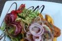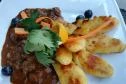 Sajnos nem nyerte el férjem tetszését, mert nagyon érződött rajta a kelkáposzta íz, amitől a falra tud mászni. Főételnek mindketten valami egytálételt kértünk, nem tudom a nevét, olyasmi, mint a brassói, de nem paprikás. Megkérdeztem, fűszeres-e, mert nem bírom akkor megenni. A válasz: nem, csak fokhagyma van benne. Oké, rendben. Ennek ellenére teljesen az volt a benyomásunk, mintha mindenféle maradék hús lenne összerottyantva baromi sok borssal és hagymával (nem fokhagymával,azzal nem találkoztunk)és krumplival. Volt benne bőrke, csirke- és sertéshús, talán szalonna is, elég zsírosan. Képtelen voltam megenni és még este is a torkomban volt az egész, olyan nehéz volt az a kis mennyiség is, amit ettem. Férjem kért még gőzgombócot, az brutális mennyiség volt és nagyon finom. Szóval a tapasztalatunk vegyes. Lehet, mást kellett volna kérnünk, de őszintén szólva az aznapi kínálatban nem szerepelt olyan, amit szívesen ettem volna. Lehet, az éttermi részen kellett volna ennünk, de késő bánat. Nem valószínű, hogy visszamegyünk.