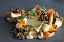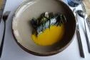 Tisztaság is kifogástalan. A hely kialakítása és hangulata letisztult és egyszerű, modern de nem fogott meg különösebben, talán egy kicsit túl hideg. Térjünk rá az ételekre. Az ár-érték arány kiváló. Ilyen ételkompozíciókat ennyiért máshol nem igen kapni. Az adagok visszafogottak voltak de nem is számítottunk többre. Szépen lassan ízlelgetve a fogásokat az ízharmóniák teljesen eltelítettek. Az előétel: kacsa · karfiol · cékla ill. lencse · gomba · zsálya el voltak találva, az ízek harmóniában voltak kivéve talán a kacsa tálon a savanyított lila karfiol, de ez talán annak is betudható, hogy nem vagyok savanyúság párti. A főétel: makréla. tengeri spárga. sáfrány + kagylók isteni és tökéletes ízélmény volt. A sáfrány öntet tökéletesen fogta össze az ízeket. A desszert: tápióka. ananász. wasabi játékos volt és merész. Merész a wasabi miatt ami ki is lógott kicsit az ízvilágból de nem túlságosan, elég enyhe volt. Szeretem a merész, kísérletező dolgokat így pozitív dologként könyvelem el. A étcsoki és ropogós narancshéj az ananász fagyival? finoman kényeztette ízlelőbimbóinkat és méltóan koronázta meg ezt a kis könnyű de mindenképpen egy élménynek számító ebédünket! Köszönjük!